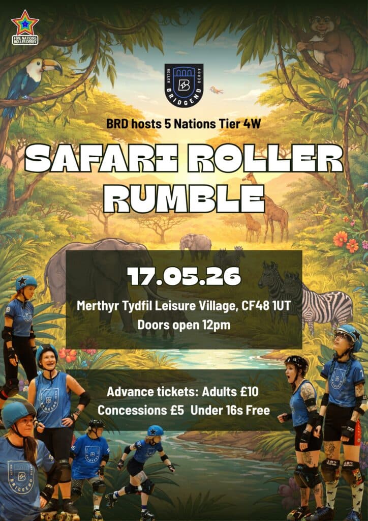 Bridgend Roller Derby are hosting two exciting games of roller derby on 17th May 2026 to close out the 2026 Tier 4 WFTDA West season. Come along to Merthyr Tydfil Leisure Village, CF48 1UT for doors open at 12 noon. Tickets in advance £10 (£5 concession) or £12 on the door. Under 16s go free.